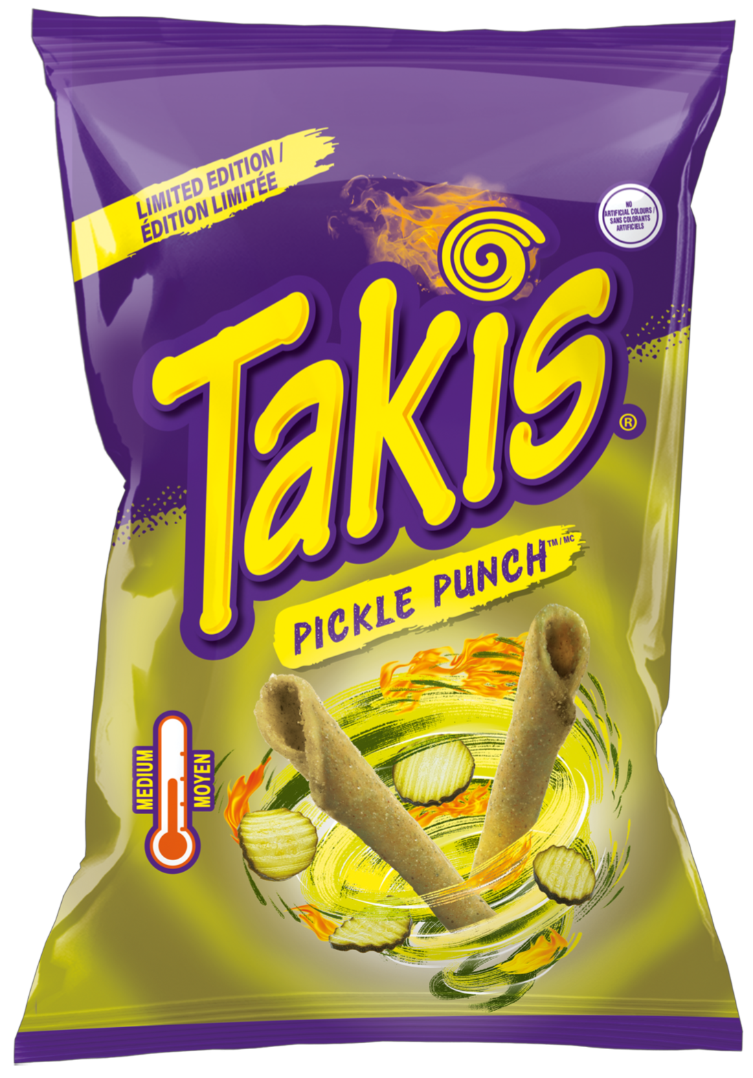 Pickle Punch™... A combination of sour, zesty, and tangy dill pickle flavour. Experience the signature Takis intensity in a puckering pickle flavour that will satisfy even the biggest sour-snack cravings. Perfect for carrying wherever you go, this bag is also great for tailgates, birthday parties, celebrations, your home pantry, or for a quick snack when on a break at the office or after school.